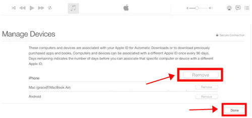 Step 4. Hit on the 'Remove' button next to the device you want to sign out from Apple Music account. Later, click on the 'Done' button to finish.