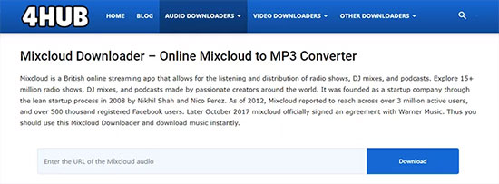 4Hub Mixcloud Downloader supports all kinds of downloads such as pictures, videos, music etc. without registration or installation. With it, you can easily download Mixcloud music, DJ mixes, radio and talk shows, etc. If you need to convert Mixcloud to MP3 format, it will also work for you. However, its servers are often very slow to use and it is not possible to download Mixcloud files more than once.